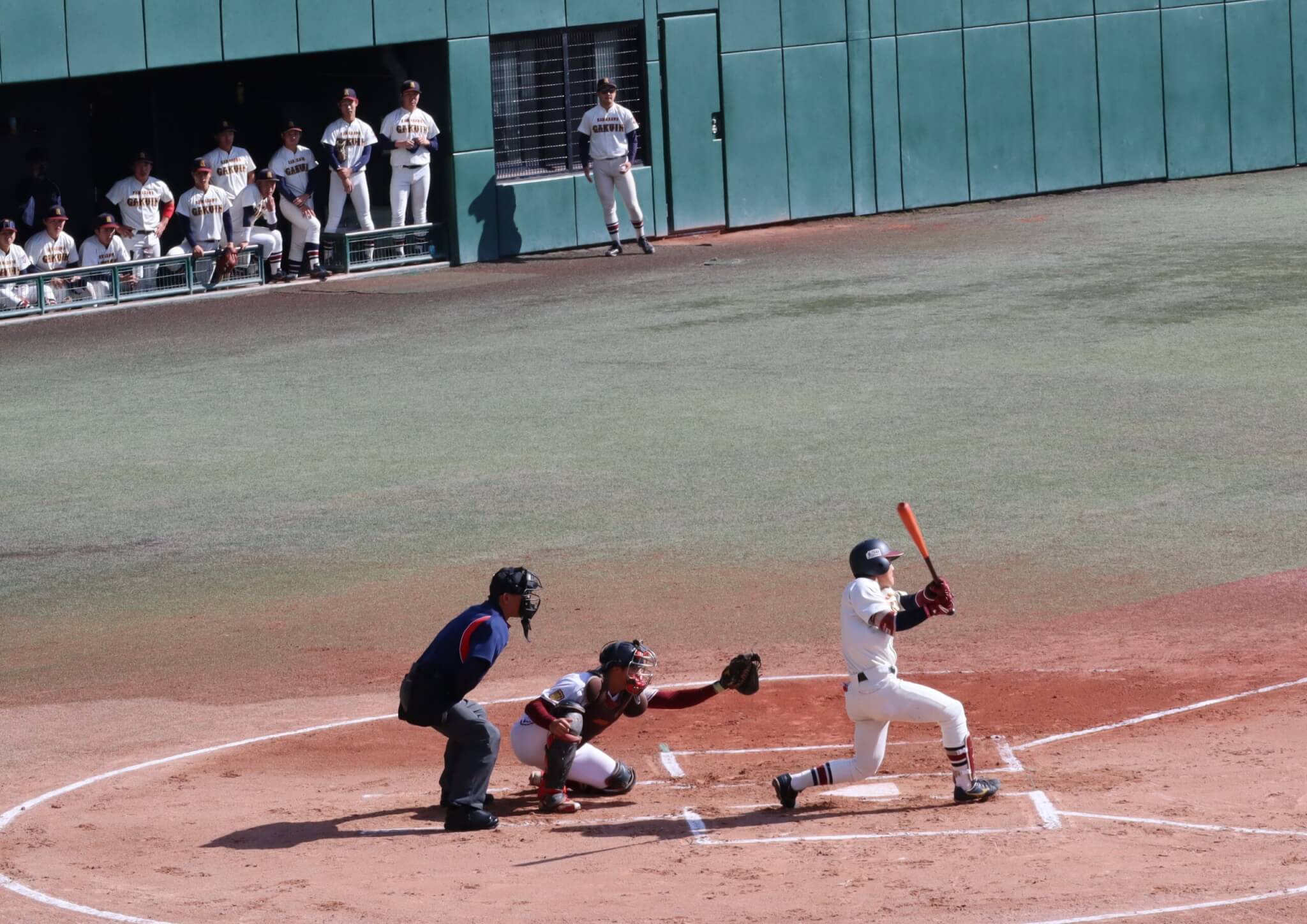 名城大学と戦った決勝戦で本学は初回、川合錬磨三塁手(経済学部2年/岡山・関西高校出身)の右翼線三塁打から新田恭也中堅手(スポーツ科学部4年/岡山・就実高校出身)の左中間適時二塁打で1点を先制。以降、再三ノーアウトでランナーを出しながらあと1本が出ず、8回まで1-9で追いかける苦しい展開になりました。9回表、南早羽己左翼手(経済情報学部4年/岩手・盛岡大学附属高校出身)の二塁打から反撃を開始し、川合選手の右前適時打、新田選手の2本目の左中間適時二塁打などで4点を返して意地を見せ、試合全体では12安打を放つも5-9で敗れる悔しい結果となりました。