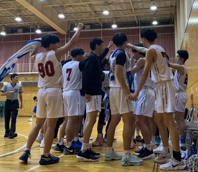 円陣を組み、気合を入れる本学男子バスケットボール部の選手たち