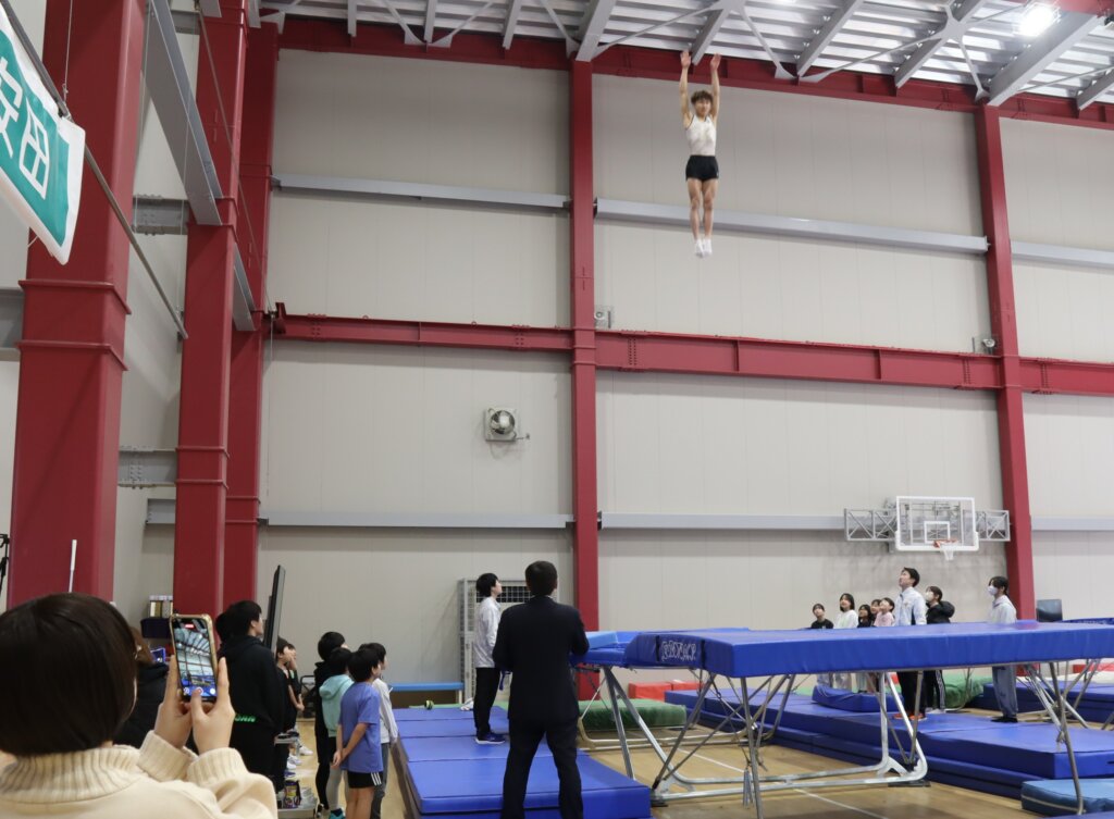 模範演技の後、体育館に設置された4つのトランポリンを使って体験教室が行われ、松本選手のほか、世界で活躍する田中沙季選手(スポーツ科学部4年/金沢学院大学附属高校出身)、櫻井愛菜選手(スポーツ科学部4年/金沢学院大学附属高校出身)、悠生選手の兄・航翔選手(スポーツ科学部4年/金沢学院大学附属高校出身)、高垣寛太郎選手(スポーツ科学部1年/金沢学院大学附属高校出身)が子どもたちを指導しました。