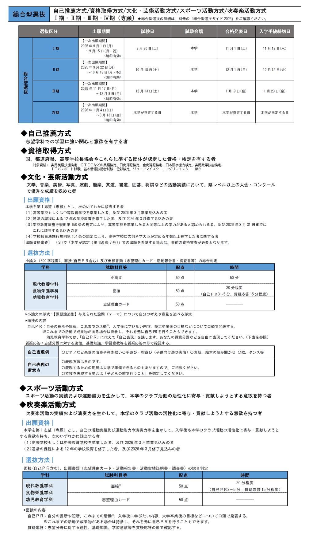 | 総合型選抜 ・自己推薦方式 ・資格取得方式 ・文化・芸術活動方式 ・スポーツ活動方式 ・吹奏楽活動方式 |