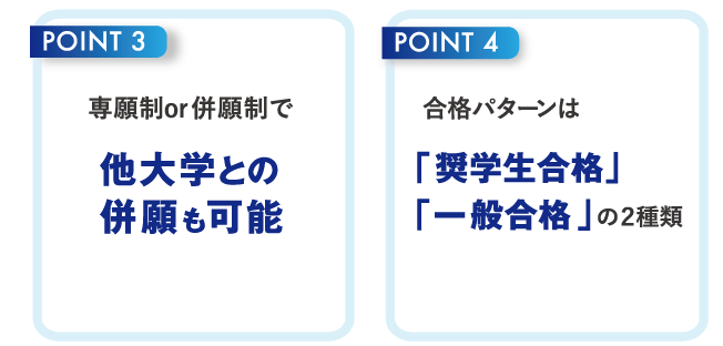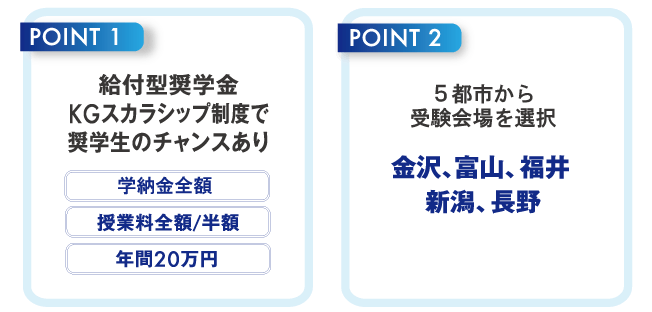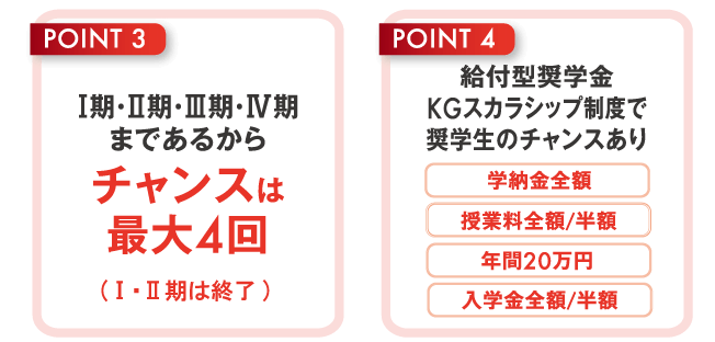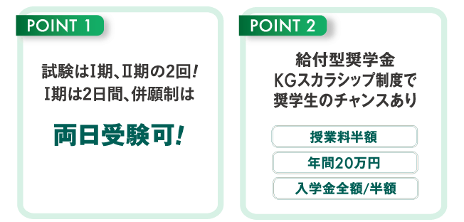 総合型選抜や学校推薦型選抜で合格し、入学手続きを完了している者は、奨学生にチャレンジする目的で、一般選抜Ⅰ期および大学入学共通テスト利用選抜Ⅰ期(KGスカラシップ/入試成績型)を入学検定料免除で受験することができます。
