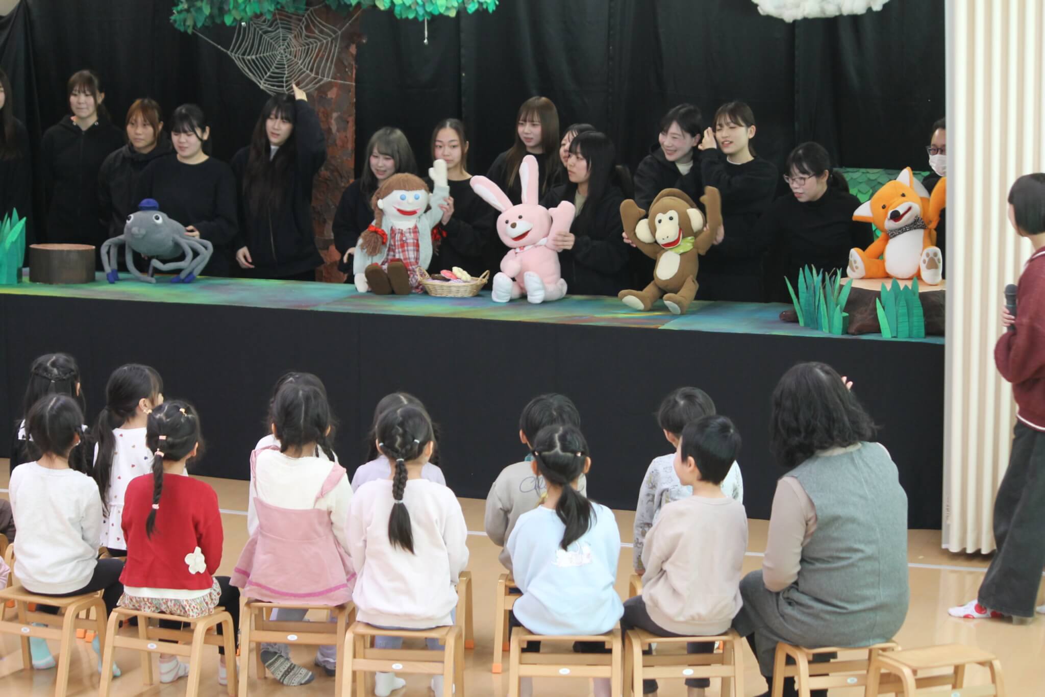 人形劇を通じて馬場幼稚園の年長児たちと交流する幼児教育学科の2年生