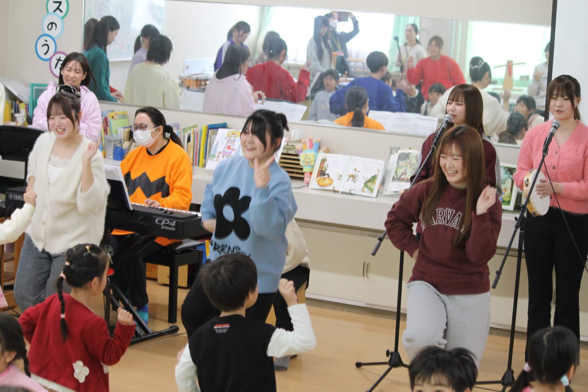 金沢学院短期大学幼児教育学科の卒業研究発表会は2月9日、保育実習室で開かれ、2年生34人がオリジナル人形劇や楽器演奏・ダンスを馬場幼稚園の年長児19人に披露しました。