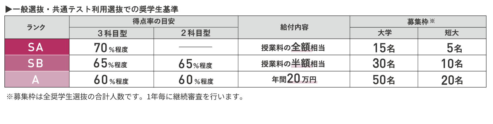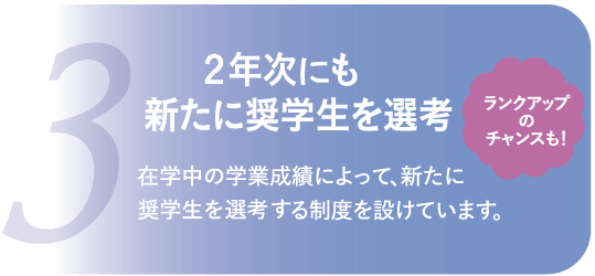 なお、上記選抜においてSBランクまたはAランクの奨学生として選考されている場合でも、より上位のランクを目指してチャレンジすることが可能です。