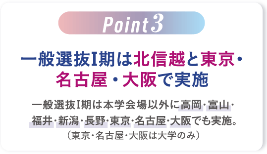 本学・高岡・ 富山・福井・ 新潟・長野・ 東京 ・名古屋・ 大阪 ※東京・大阪・名古屋は大学のみ (実技は本学会場のみ) |