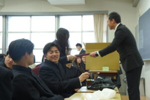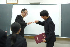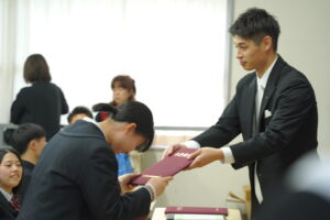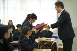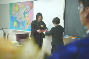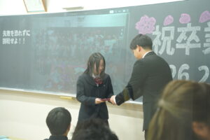 厳粛な雰囲気の中で卒業証書が授与され、式後は各教室にて担任より一人ひとりへ証書が手渡されるとともに、最後のメッセージが贈られました。