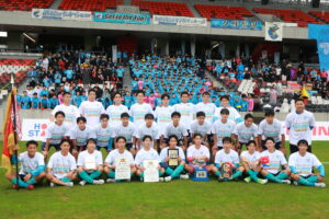 準決勝同様雨が降る中、前半17分に家邊(3年スポーツコース)が先制ゴールをあげ、その1点を守り切り、2年連続2回目の優勝を果たしました。