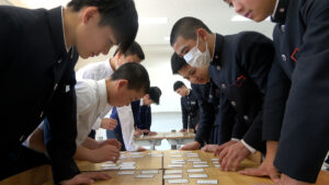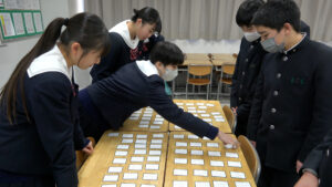 大会では、1、2年生がそれぞれ3人1組の班に分かれ、チーム戦で競い合いました。札の読み上げには、プログラミングの授業で生徒が作成したプログラムを活用しており、国語とプログラミングの学びの成果が発揮される機会となりました。