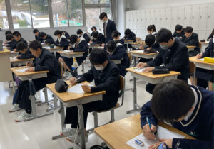 初日の11日(火)は国語の実施日でした。生徒たちは、これまでの学習の成果を発揮しようと、いつもより早く登校して準備に励む姿も見られました。