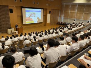 福井県を代表する二大産業の一つである繊維業界の歴史や、同社が現在取り組む医療分野への進出について、詳しくお話しいただきました。特に、自社製品である「心・血管修復パッチ」の開発経緯に触れられた際には、髙木氏が「世界の子どもたちを助けたいという思いが成功につながった。皆さんも勉強を重ね、ぜひ医療業界に挑戦してほしい」と熱く語られました。
