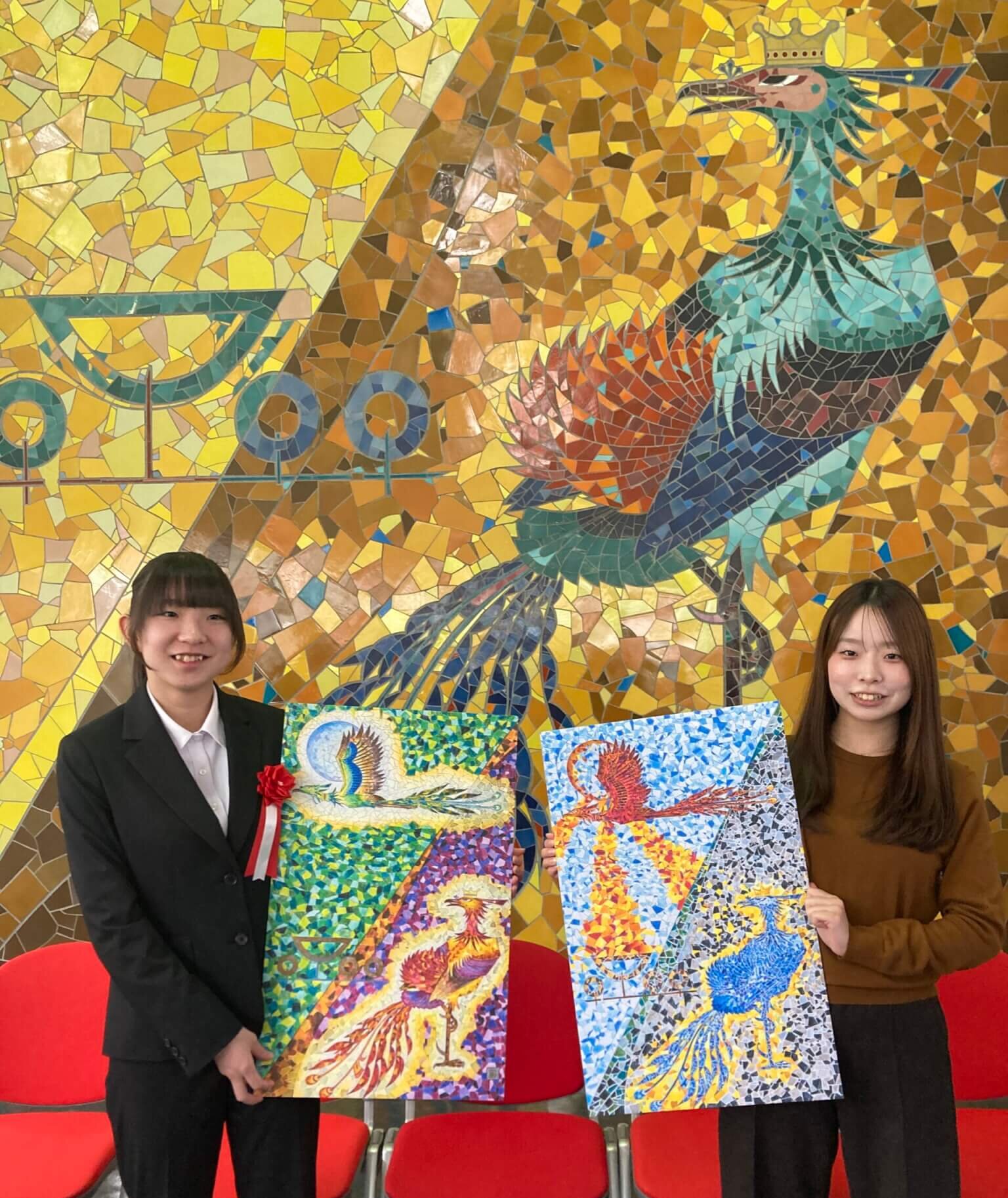 全国各地、海外からも応募があり、集まった作品は1,201点。その中から栄えあるグランプリを受賞したのが、教育学部幼稚園教諭・保育士専攻1年の小林万由加さん(金沢学院大学附属高校出身、写真左)でした。さらに、第10回特別記念賞に小学校・中学校教諭専攻1年の新江流夏さん(石川県立七尾高校出身、写真右)が選ばれ、同じく教育学部の阿部和夏さん、浮田藍子さん、北野晏都さん、小不動湧大さん、三浦優生さんの5名が入選を果たしました。
