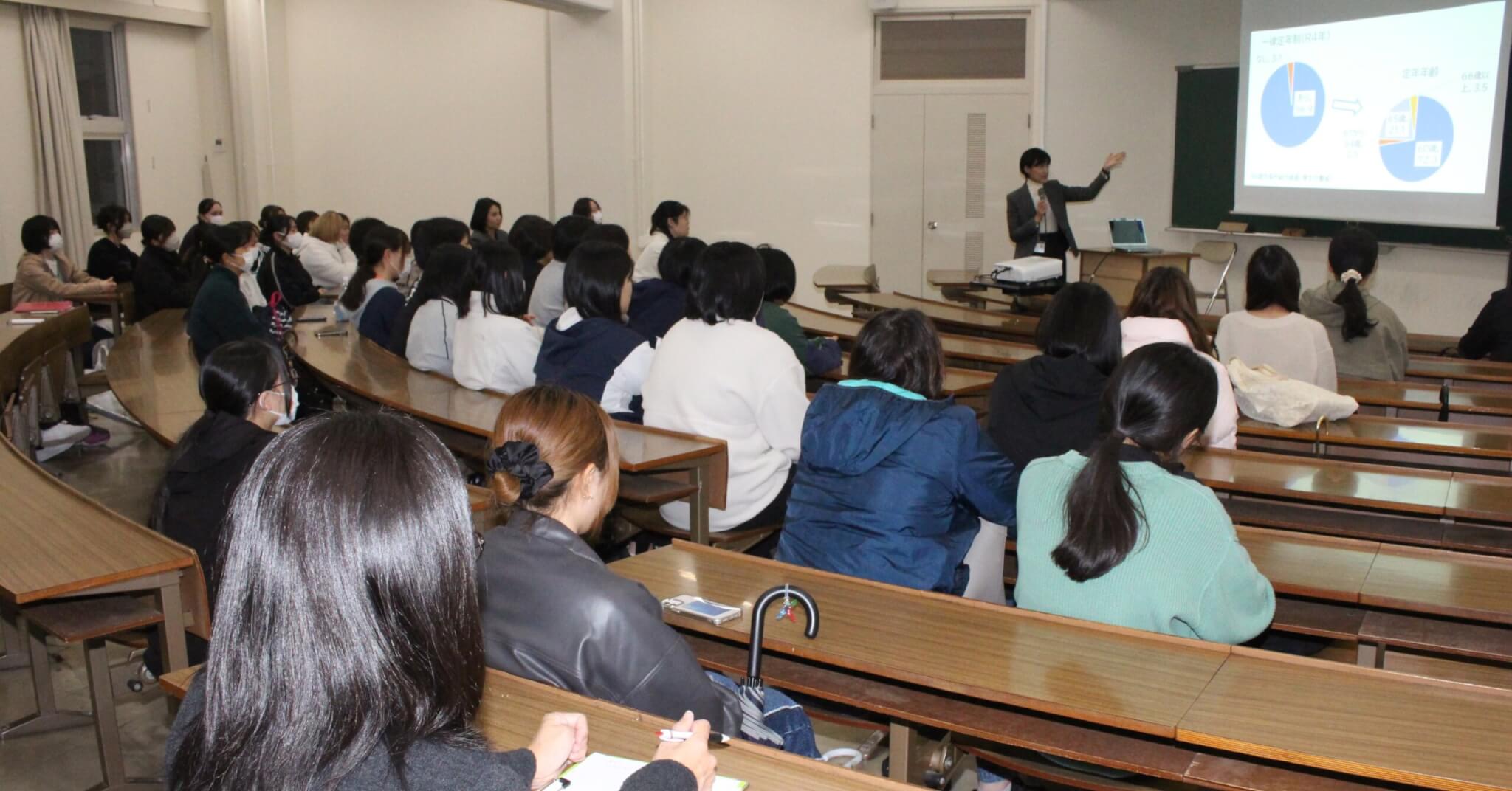 金沢学院大学女子寮の教育イベント「私が輝く働き方を考える」は11月21日、416講義室で行われ、経済学部の奥井めぐみ教授が約50人の寮生に「自分が〝輝く〟働き方」ができるよう積極的に企業情報を入手することの重要性を説明しました。