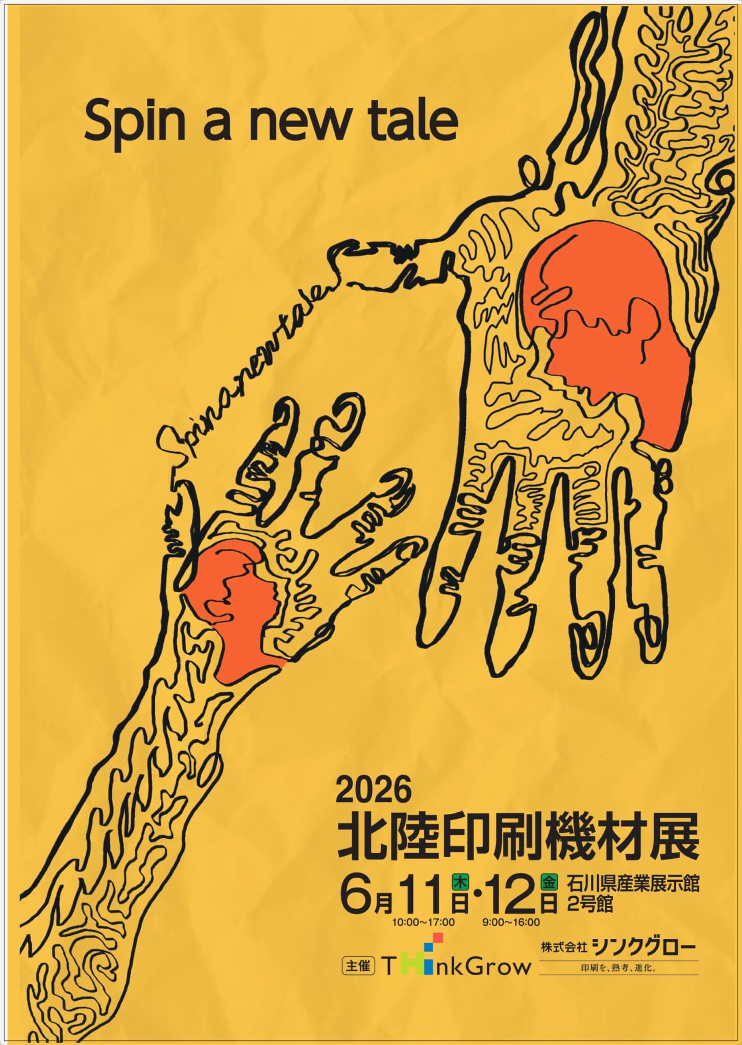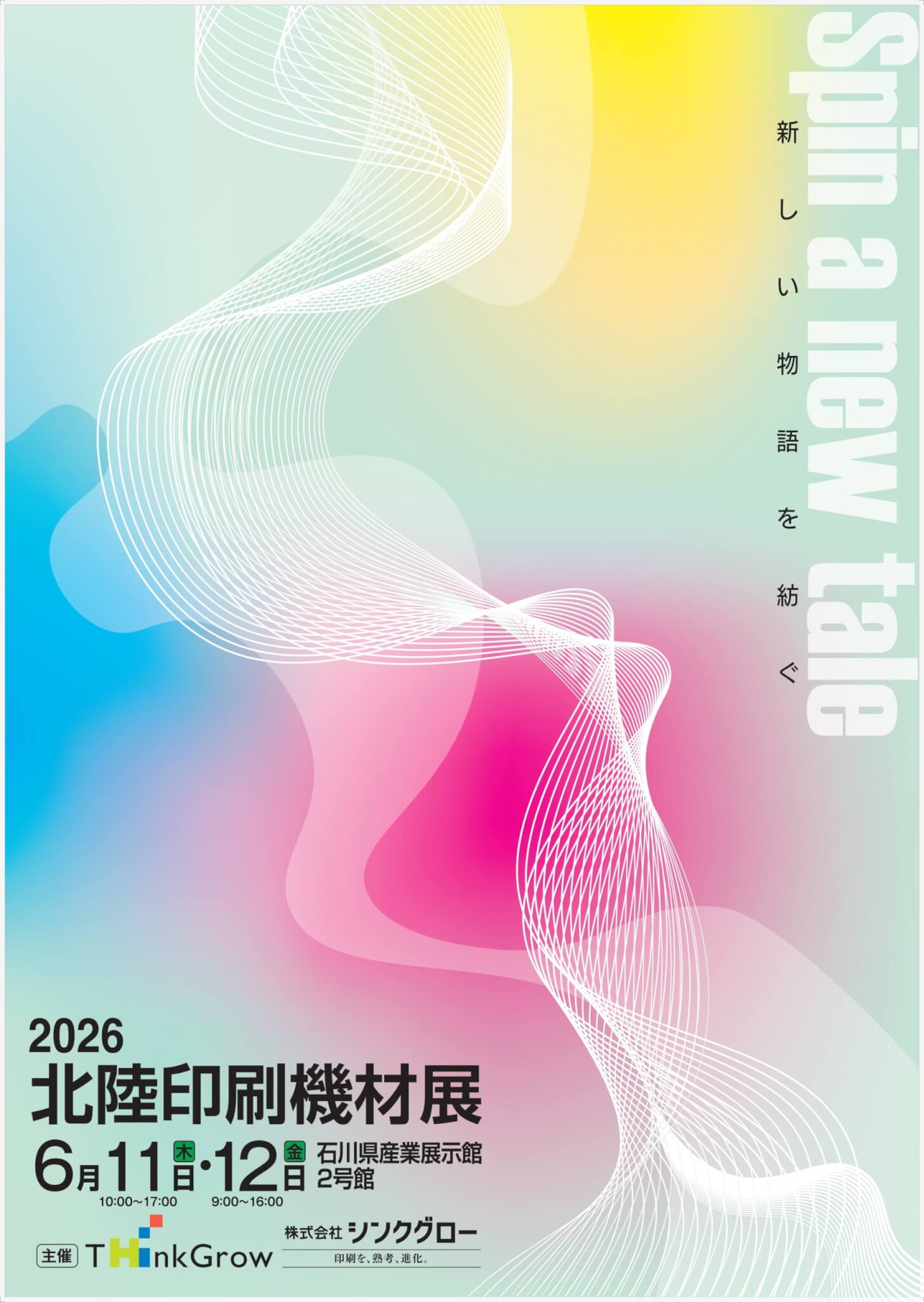 北陸印刷機材展は毎年、約50社が参加して機材展示やデモンストレーション、セミナー、技術講習会などを行う印刷に関する総合エキシビジョンです。2026年のキャッチコピーは「Spin a new tale」、新しい物語を紡ぐという意味が込められています。