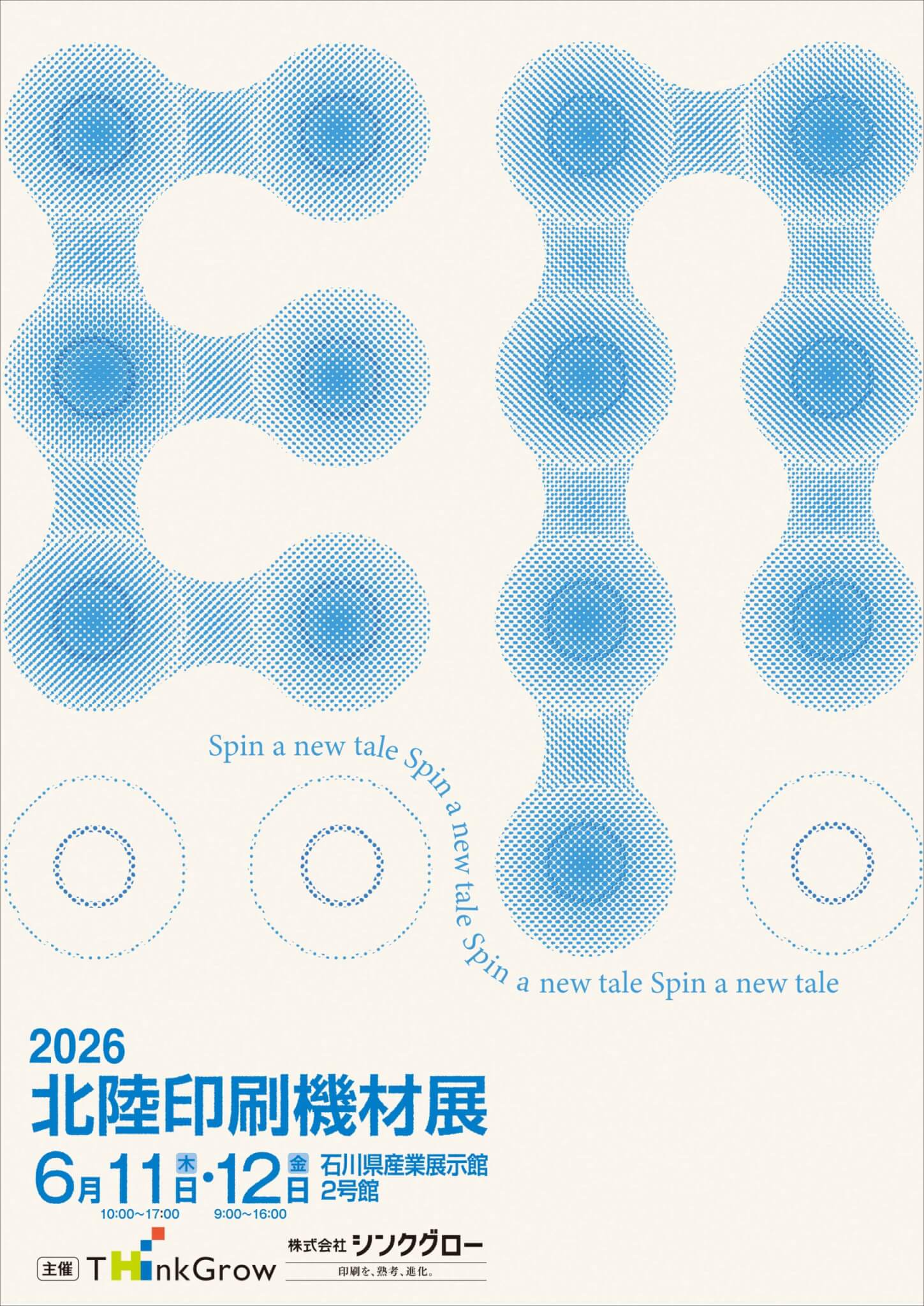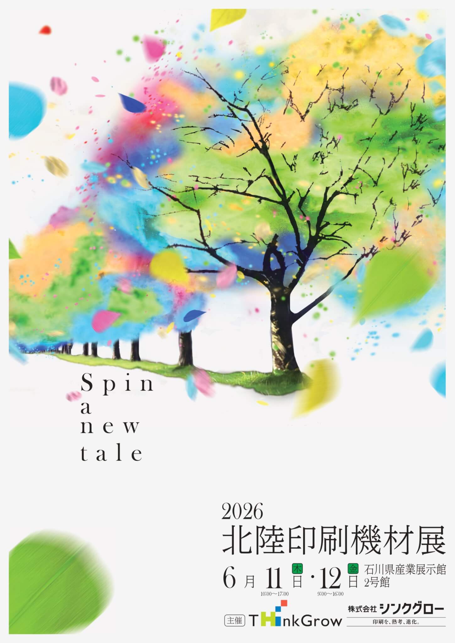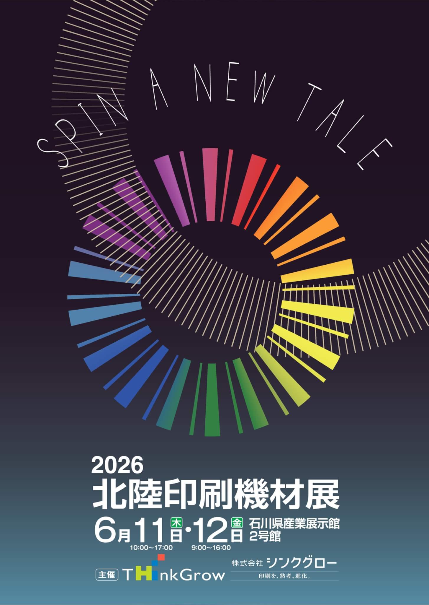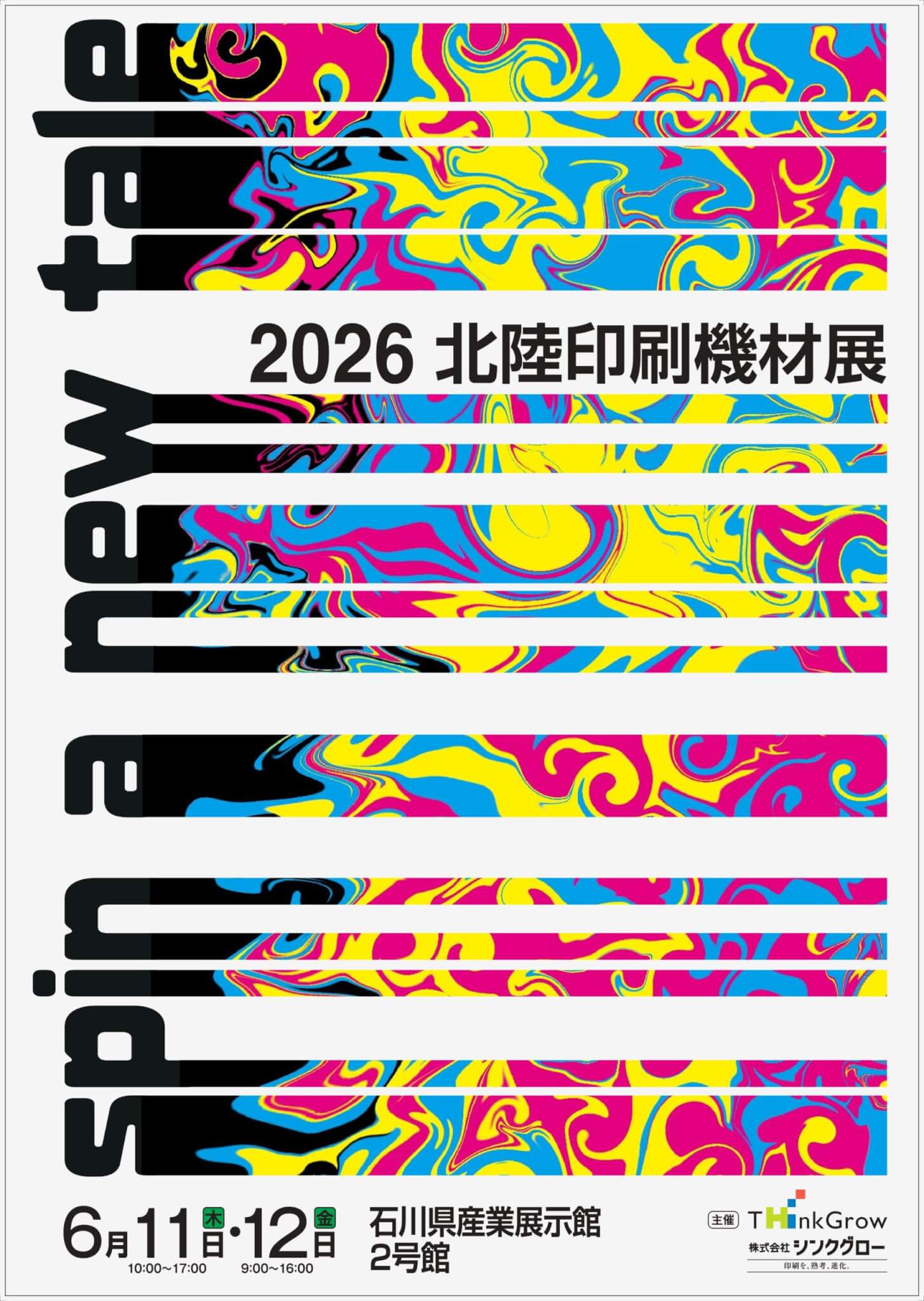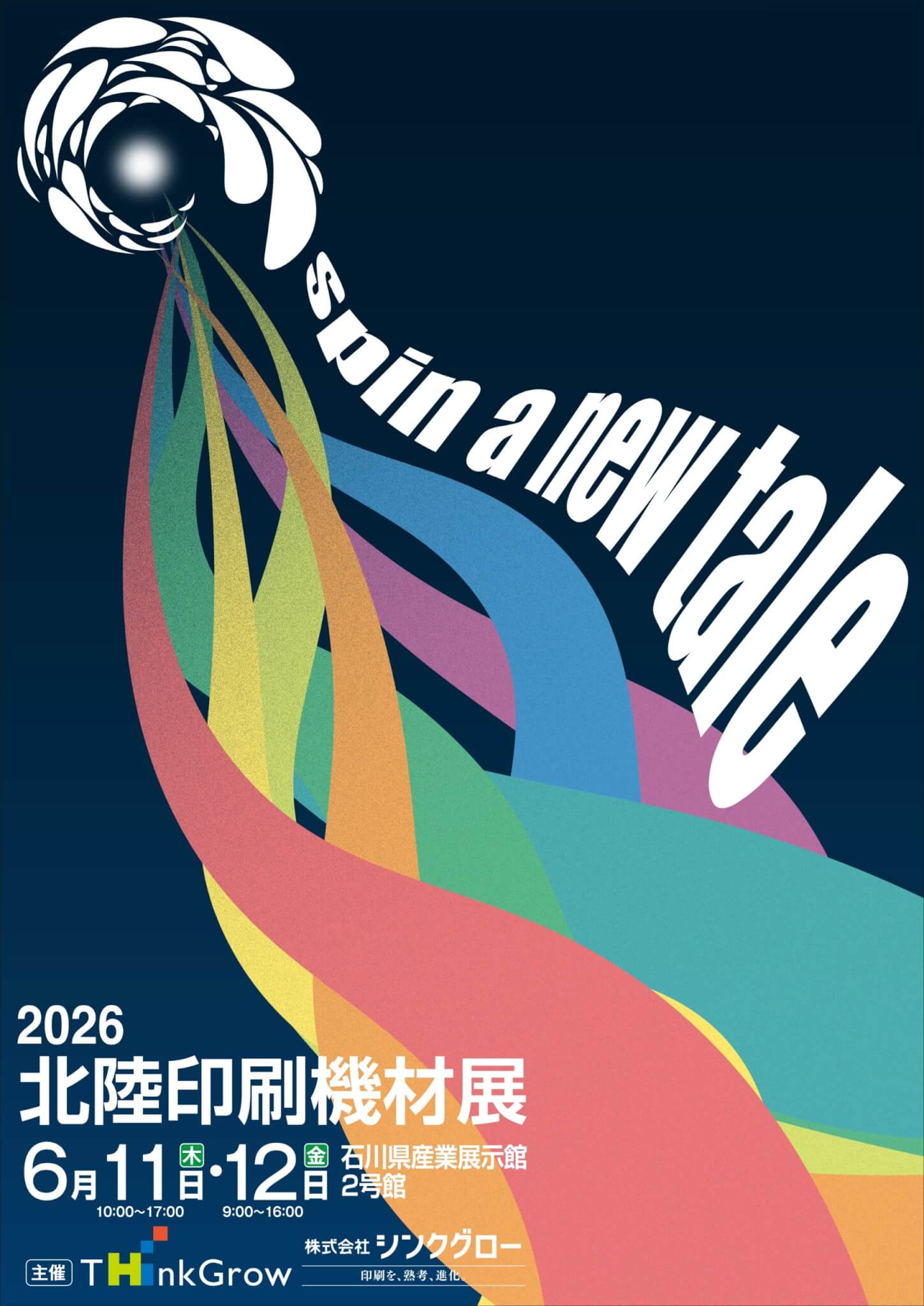 北陸印刷機材展は毎年、約50社が参加して機材展示やデモンストレーション、セミナー、技術講習会などを行う印刷に関する総合エキシビジョンです。2026年のキャッチコピーは「Spin a new tale」、新しい物語を紡ぐという意味が込められています。