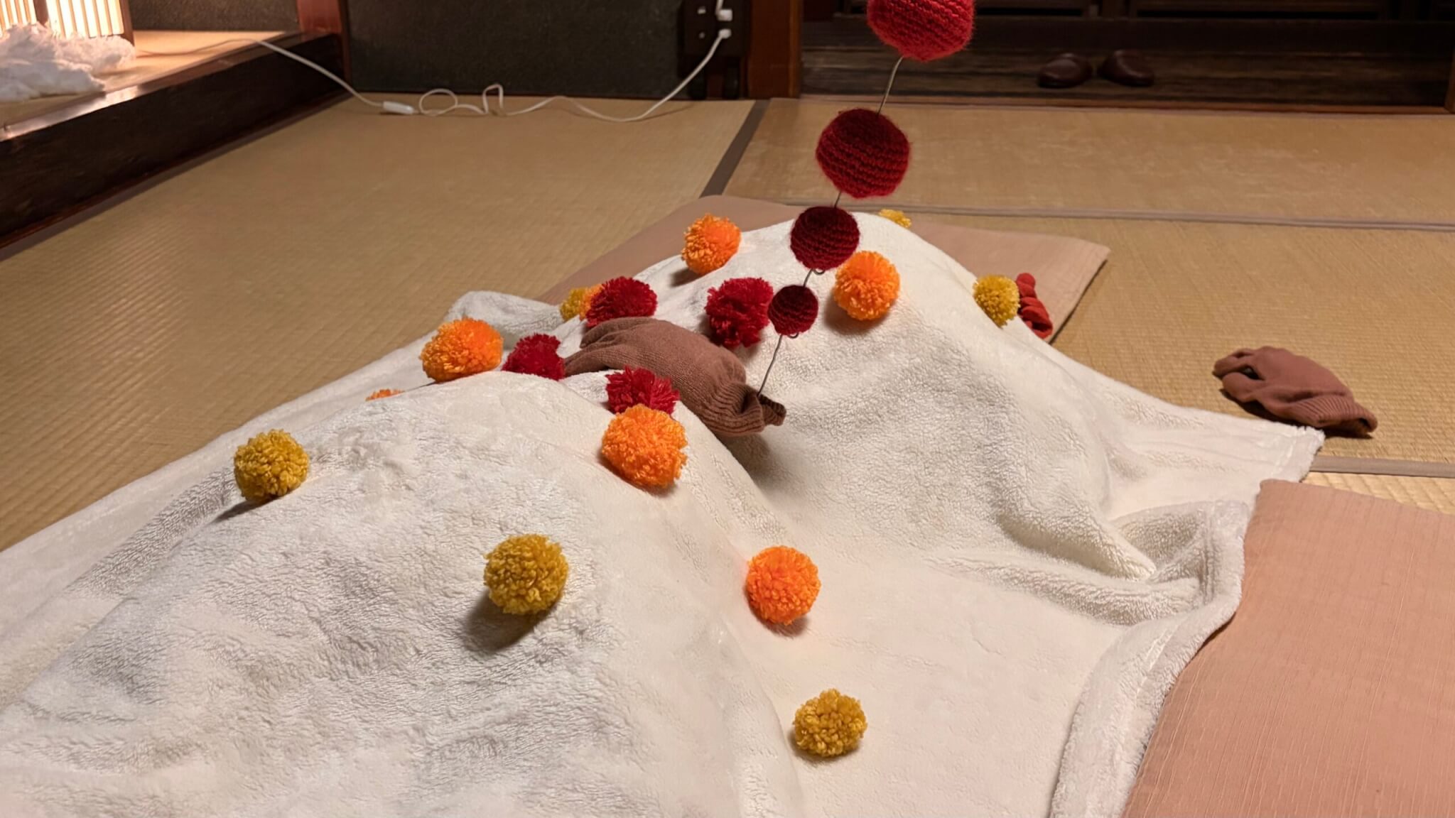 インスタレーション「つなぐ間」は現代の多様な視点を重ね合わせる挑戦的な試みで、「つながりの再考」をテーマに展示を行いました。伝統的な町家の部屋や蔵の空間全体を使い、時間や感情、人と人の関係性などさまざまなつながりを表現しました。会場には本学の学生や一般のアートファンが訪れ、癒やされたり、懐かしく感じたり、不思議な感覚がわいてきたりなど、いろいろな感情を抱きながら作品を鑑賞し、目に見えないつながりに思いを巡らせました。