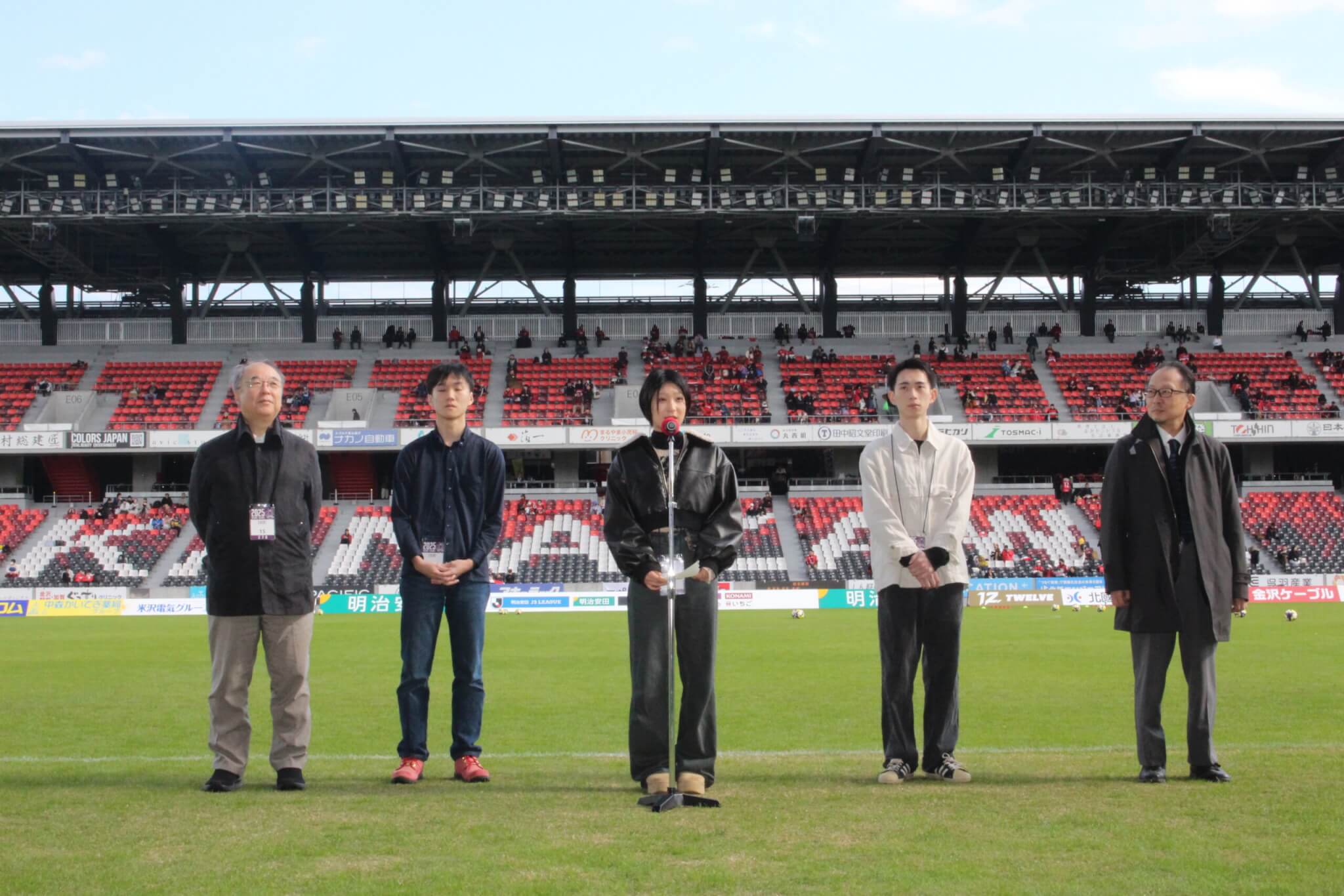 金沢学院大学芸術学部の学生4人が東金沢駅から金沢ゴーゴーカレースタジアムにつながる歩行者誘導シートのデザインを手掛け、11月2日、ツエーゲン金沢のホーム公式戦・ザスパ群馬戦のキックオフ前、学生3人がピッチ上で紹介されました。