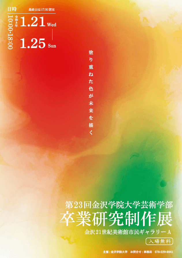 第23回金沢学院大学芸術学部卒業研究制作展が1月21日(水)から、金沢21世紀美術館市民ギャラリーAで始まります。絵画、造形、ビジュアルデザイン、映像・メディア、デザイン工学の5つの表現領域(専攻)の4年生52人が試行錯誤を重ねた末の力作を展示します。