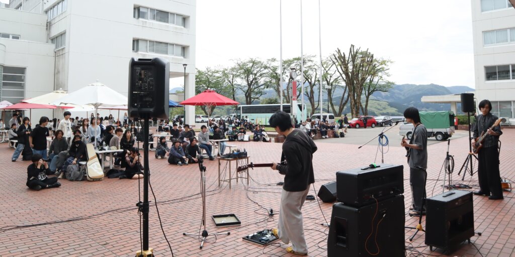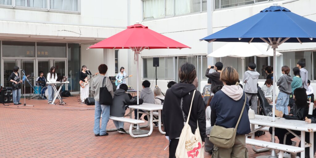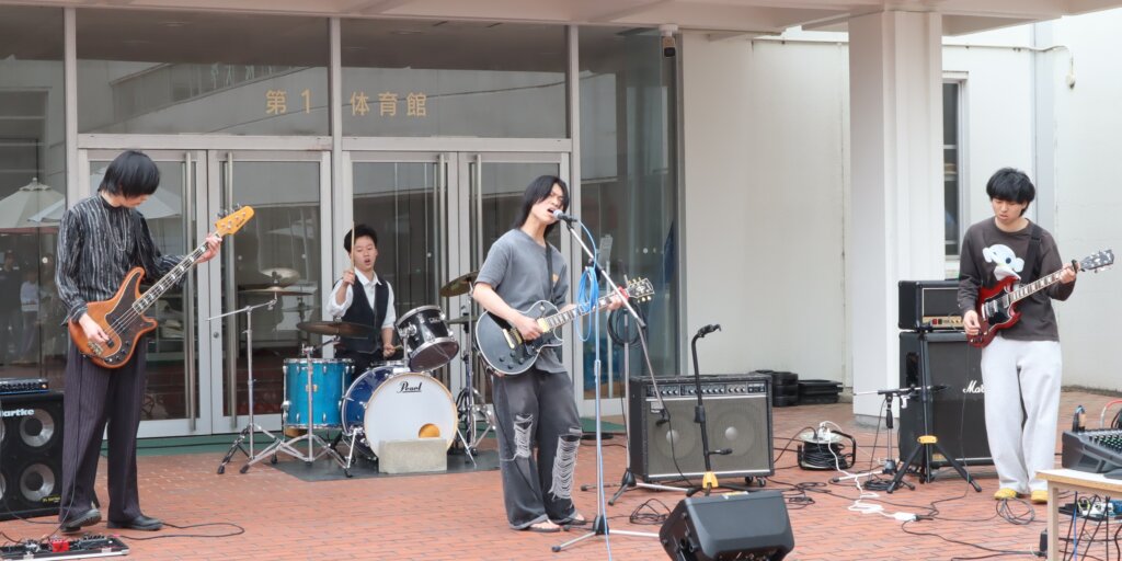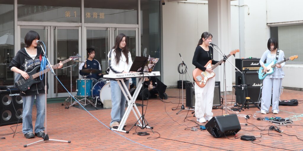 出演したバンドは「ミセス」と「やまびこ」で、テラス席に集まった多くの学生がノリの良い曲に合わせて手拍子をするなど盛り上がりを見せました。軽音楽部は楽器に触ったことがない初心者からバンド経験者まで幅広い学生が集まり、アクションハウス2階と部室棟スタジオを練習場所とし、ジャンルもスタイルも自由に活動しています。部長の酒井華珠さん(文学部文学科日本文学専攻3年)は「音楽が好きな人は気軽に遊びに来てください。一緒にバンドをやりましょう!」と呼びかけかけました。