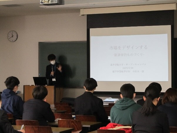 体験授業は経済学科が小田圭一郎教授の「市場をデザインする:経済学的ものづくり」、経営学科が児島記代講師の「決算書を読んでみよう!」でした。小田教授からは、近年ノーベル経済学賞の受賞で注目されているゲーム理論について、実は身近なところで役立っているという話がありました。児島講師は税理士でもあり、実際の企業の決算書をとりあげつつ、決算書の見方の基礎が説明されました。