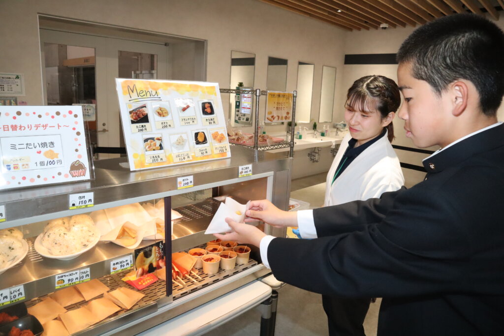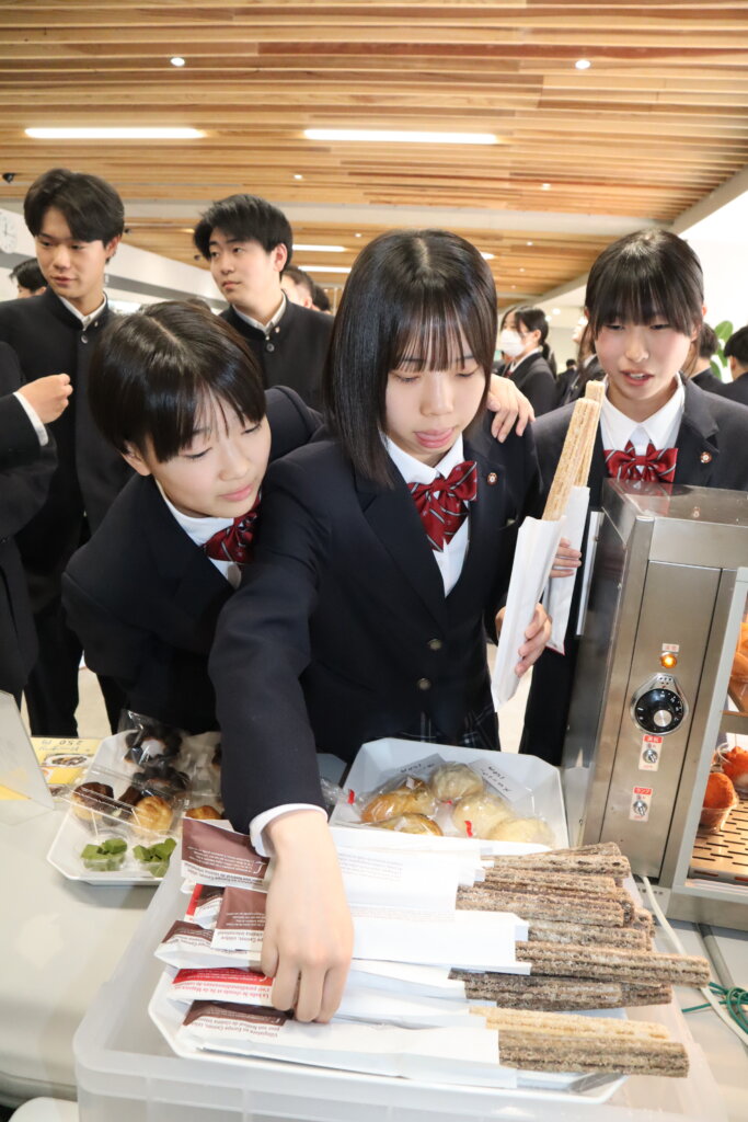 1番人気は「チュロス」で、KGダイニングの調理場で揚げ、熱々の状態で販売しており、約150本を売り上げる日も。KGダイニングで昼食を食べに来た高校生らは昼食の食券を買うついでにチュロスを購入し、「揚げたてで、おいしい」「サクサクで甘さもちょうどいい」と話し、評判は上々。家から持ってきたお弁当を手にした女子高校生たちもチュロスを買い、「お弁当の後にデザートとして食べます」と笑顔で話してくれました。販売スタートから1週間余りで、生徒たちは「何回も食べました。リピーターです」「みんながおいしいと言うので、買いに来ました」など口コミで人気が広がったようです。