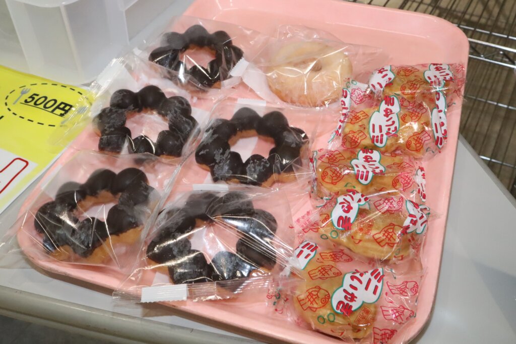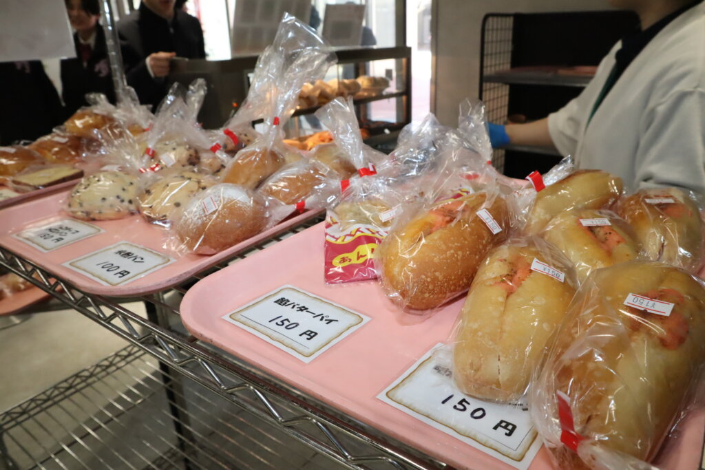 販売されているのは、ボリューム満点のお弁当のほか、チュロスやたこ焼き、ドーナツ、手づくりパンなどの軽食類です。お弁当はKGダイニングでその日提供されている昼定食がそのままお弁当スタイルになっており、教室でゆっくり食べることができます。軽食はKGダイニングで調理された出来立てのチュロスやたこ焼き、ドーナツなどのスナック類、当日朝に3号館食堂2階で焼き上げたパンが並んでいます。お弁当は500円、軽食はたこ焼き200円、ポテト200円、フランクフルト200円、からあげ90円、いももち150円、おにぎり(大)150円、コロッケ90円、アップルパイ150円、チュロス300円、ドーナツ250円、手づくりパン100~150円。そのほか、日替わりデザートがあり、ミニたい焼き100円、シュークリームとエクレアは120円となっています。