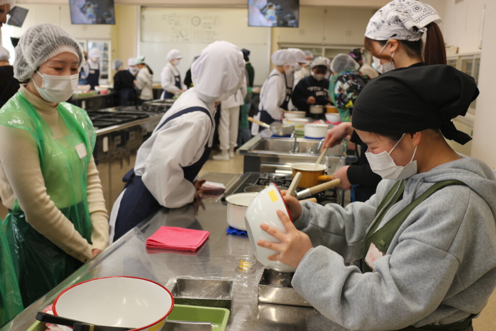 金沢食文化アカデミー2025の公開講座「加賀野菜とチョコのマリアージュ」は2月7日、金沢学院大学5号館第1調理学実習室で開かれ、参加者約30人が小坂蓮根や五郎島金時、地元の味噌などを使った新感覚のチョコレート作りに挑戦しました。