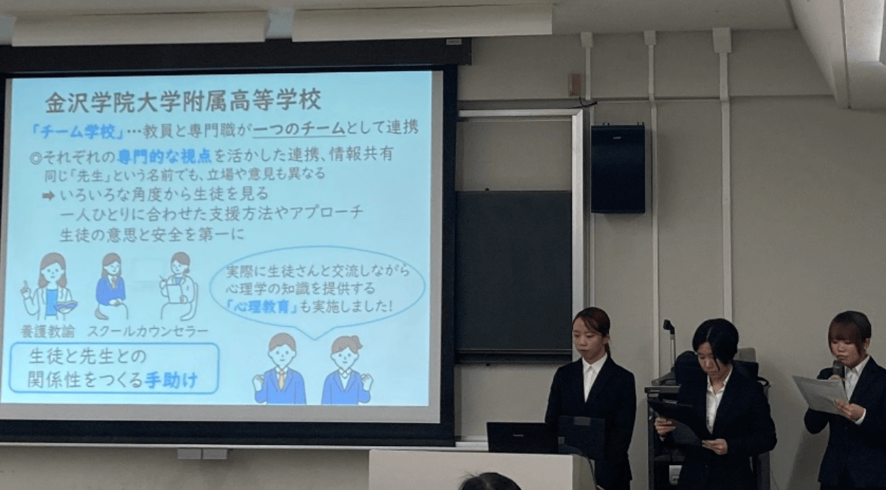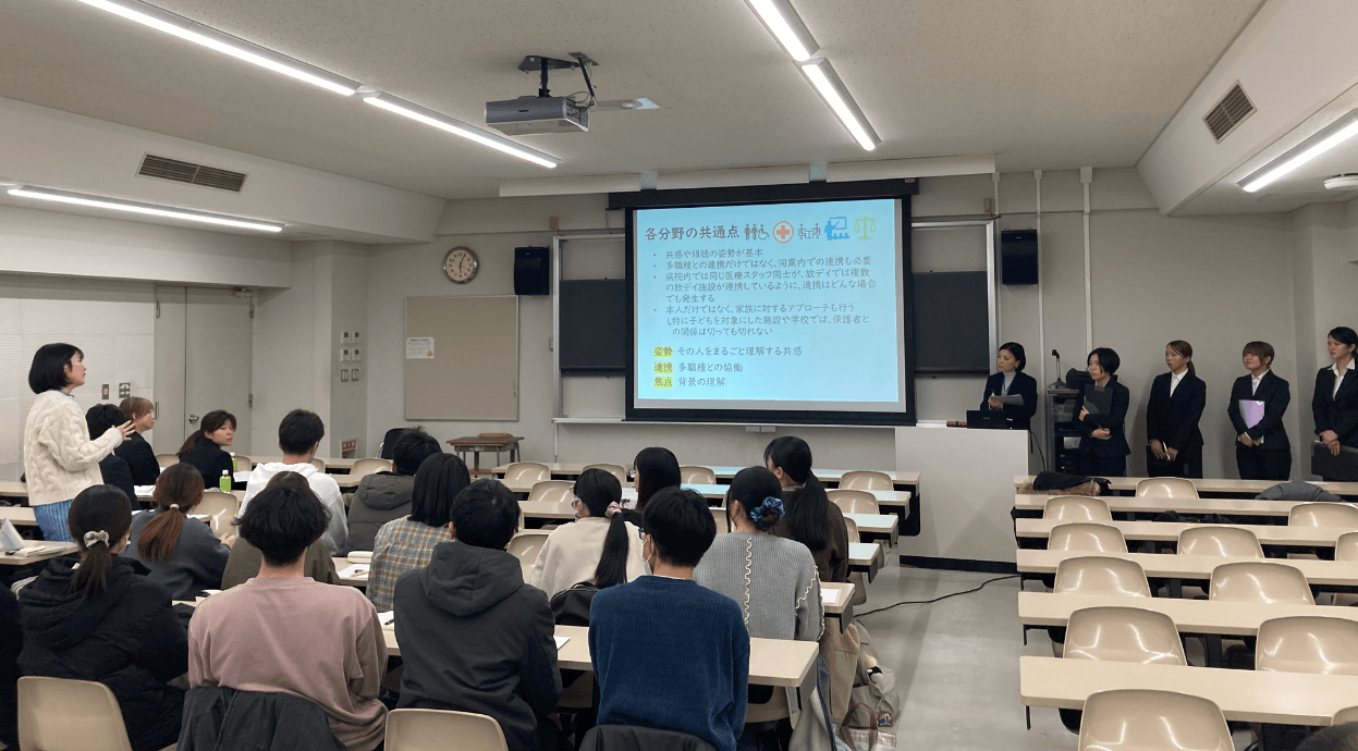 報告会では、まず各分野での施設や支援の概要を紹介した上で、それぞれの現場で大切にされている姿勢や連携の重要性、各分野の特徴などを紹介。その上で、学生自身の成長や課題に関する考察を発表しました。