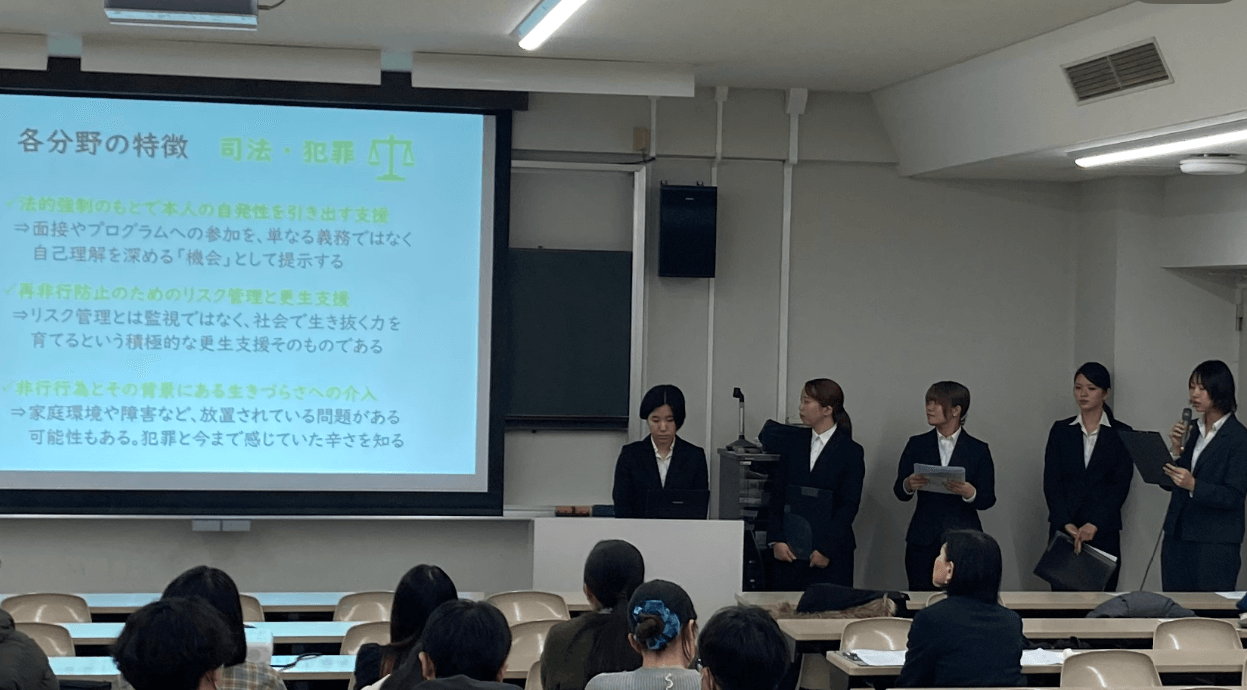 プレゼンテーションの後は質疑応答があり、学生からは、司法分野についての質問や、支援における姿勢を問う疑問も出て、発表した実習生自身の理解もより深まったようです。
