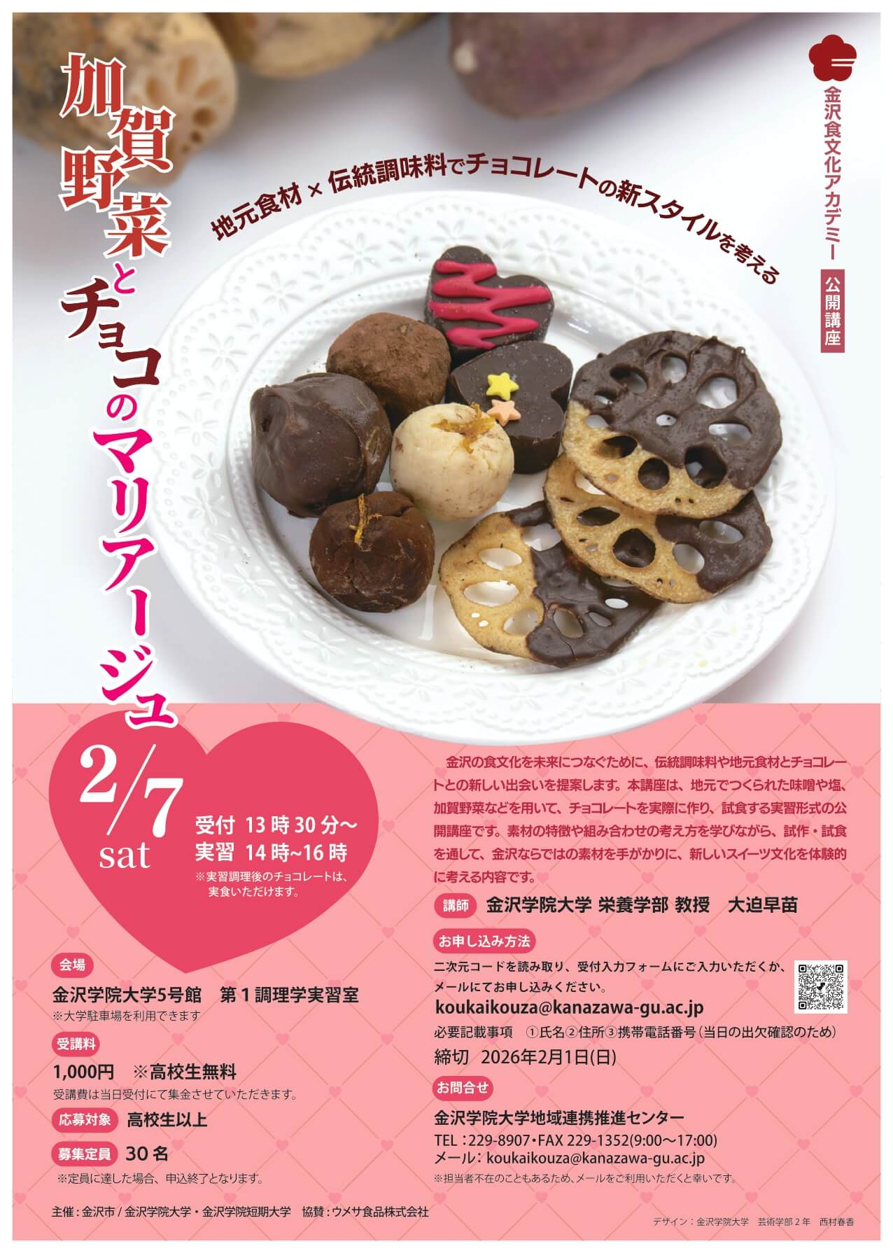 金沢市と金沢学院大学の連携協定による公開講座「加賀野菜とチョコのマリアージュ」が2月7日14時から、金沢学院大学5号館第1調理学実習室で開催されます。16時まで(受付13時30分から)。