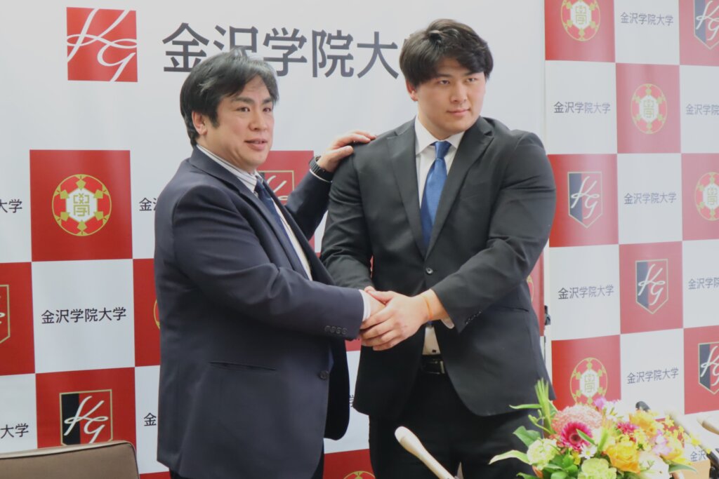 幕下付出で5月場所の初土俵を目指す大森選手は「故郷を離れ、高校、大学で金沢学院に来て本当に良かった。角界で活躍する地元出身の先輩力士に追いつけ追い越せで稽古し、横綱を目指したい」と将来を見据えました。